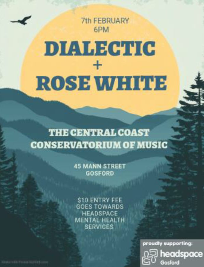 Dialectic (local electronic artist/drummer) and Rose White (experimental artist from Newcastle) perform at the Central Coast Conservatorium Of Music in Gosford on February 7th from 6pm. $10 entry fee is a fundraiser for Headspace youth mental health services. Live music with backing visuals in order to help a vital service on the Coast.